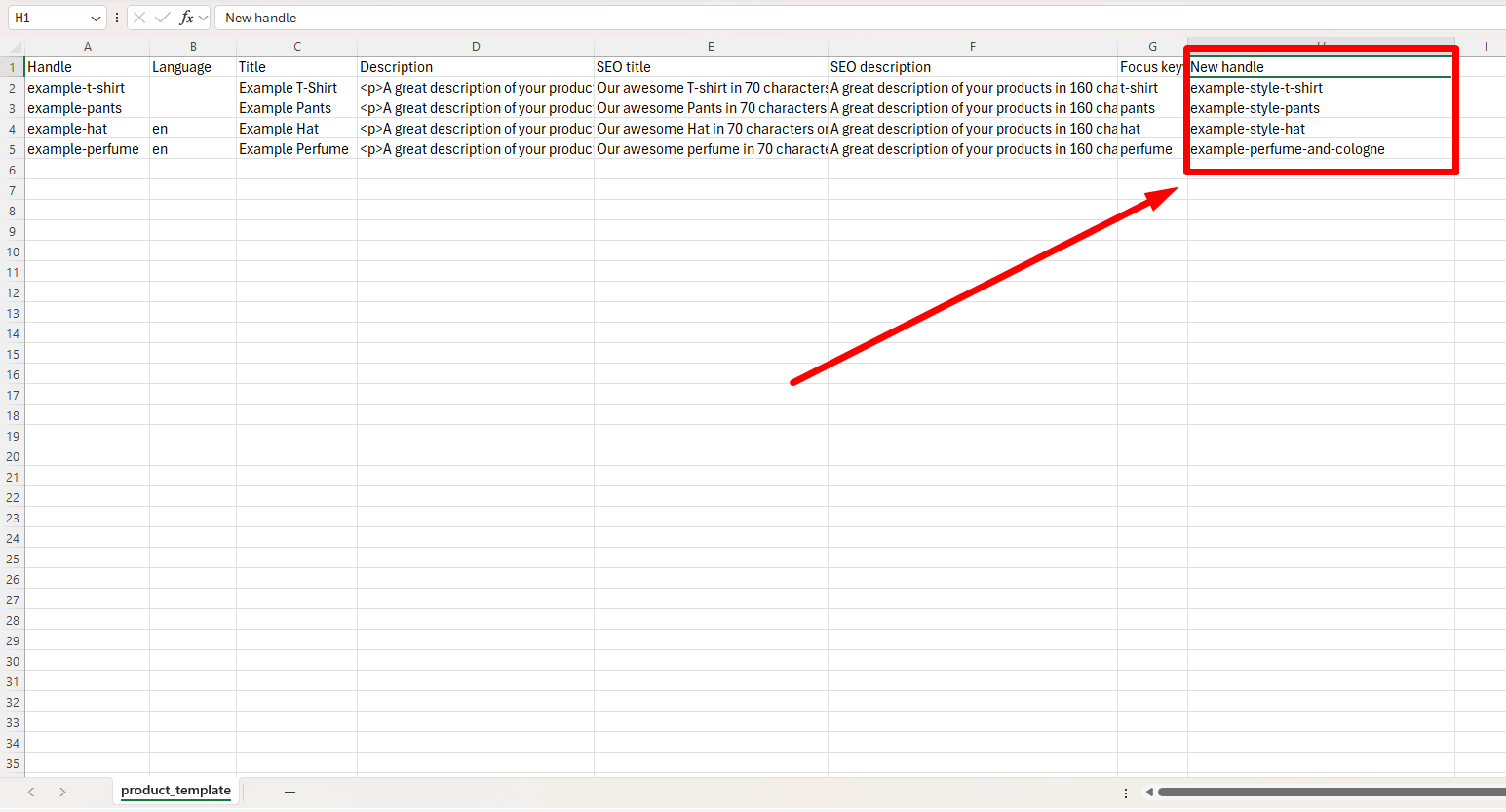 - You can update new handles for your existing pages that have "Too long URLs" error by uploading a new handle under the New handle column at the end.