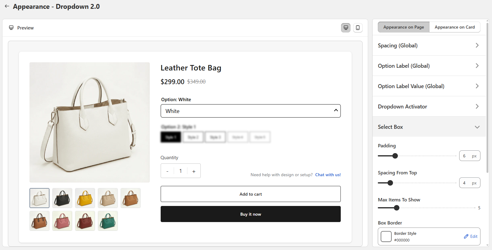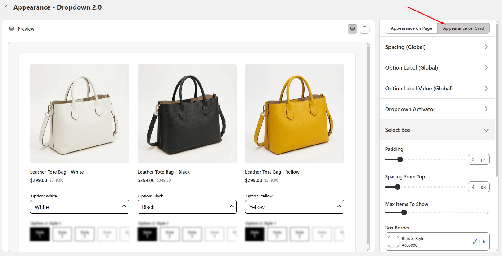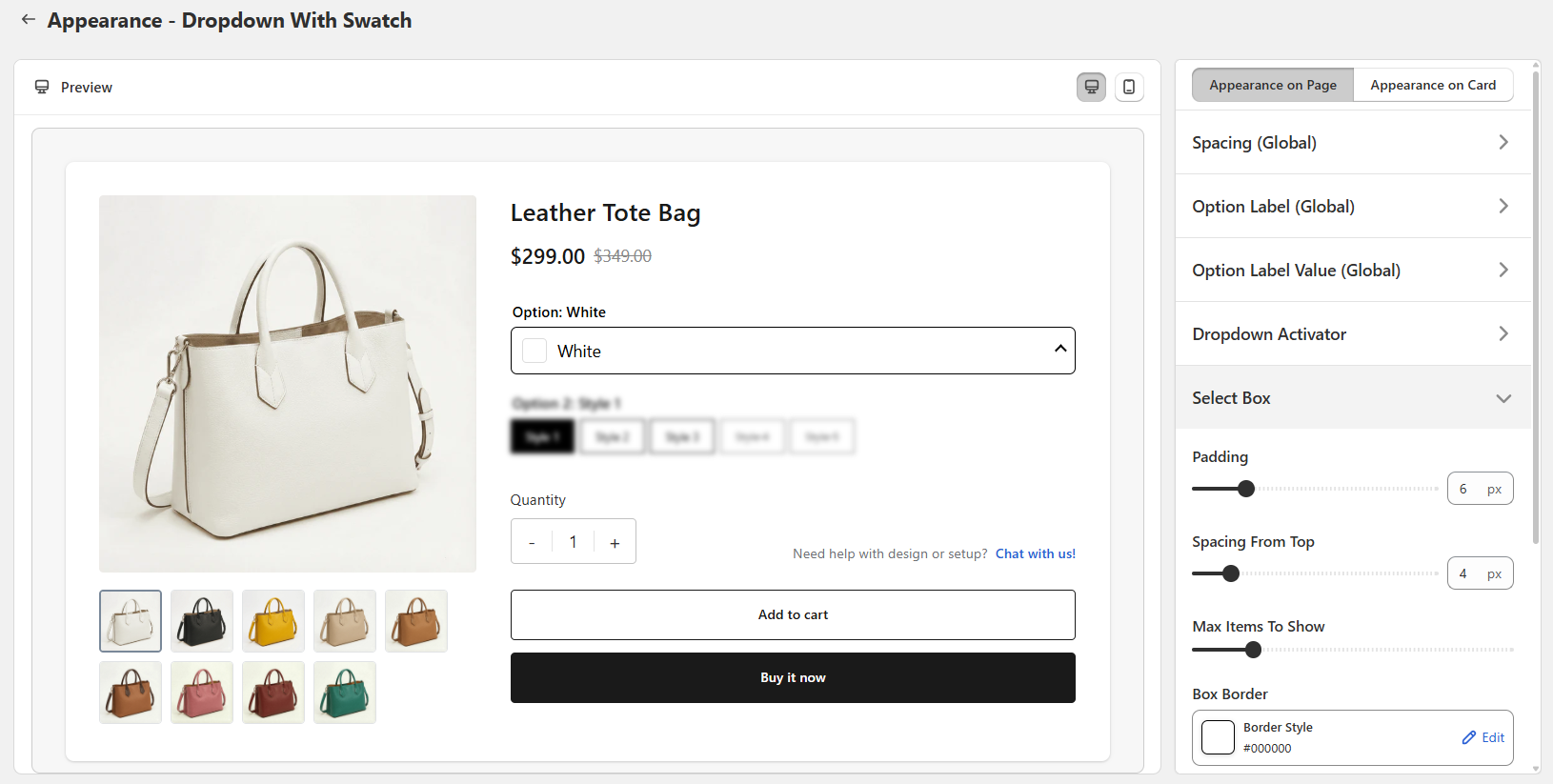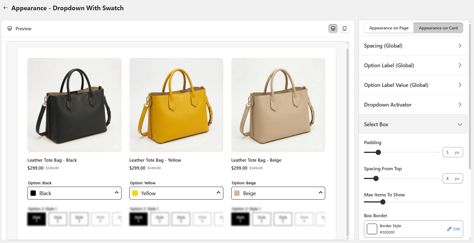 To go to Appearance on Page and Appearance on Card configurations, locate to the left tab menu after clicking ‘Customize’ on a certain Color Swatch style. On the right side, you can see the preview section of how your customizations will show up on the storefront.