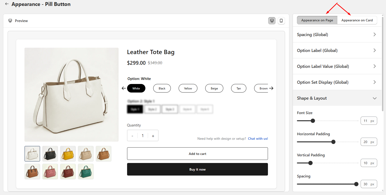 Button and Pill Button have the same condition and options for configurations. Therefore, this guide will tell you how to configure the swatches with a comprehensive and applicable guideline for both swatch styles and both Appearance on Page and Appearance on Card.
