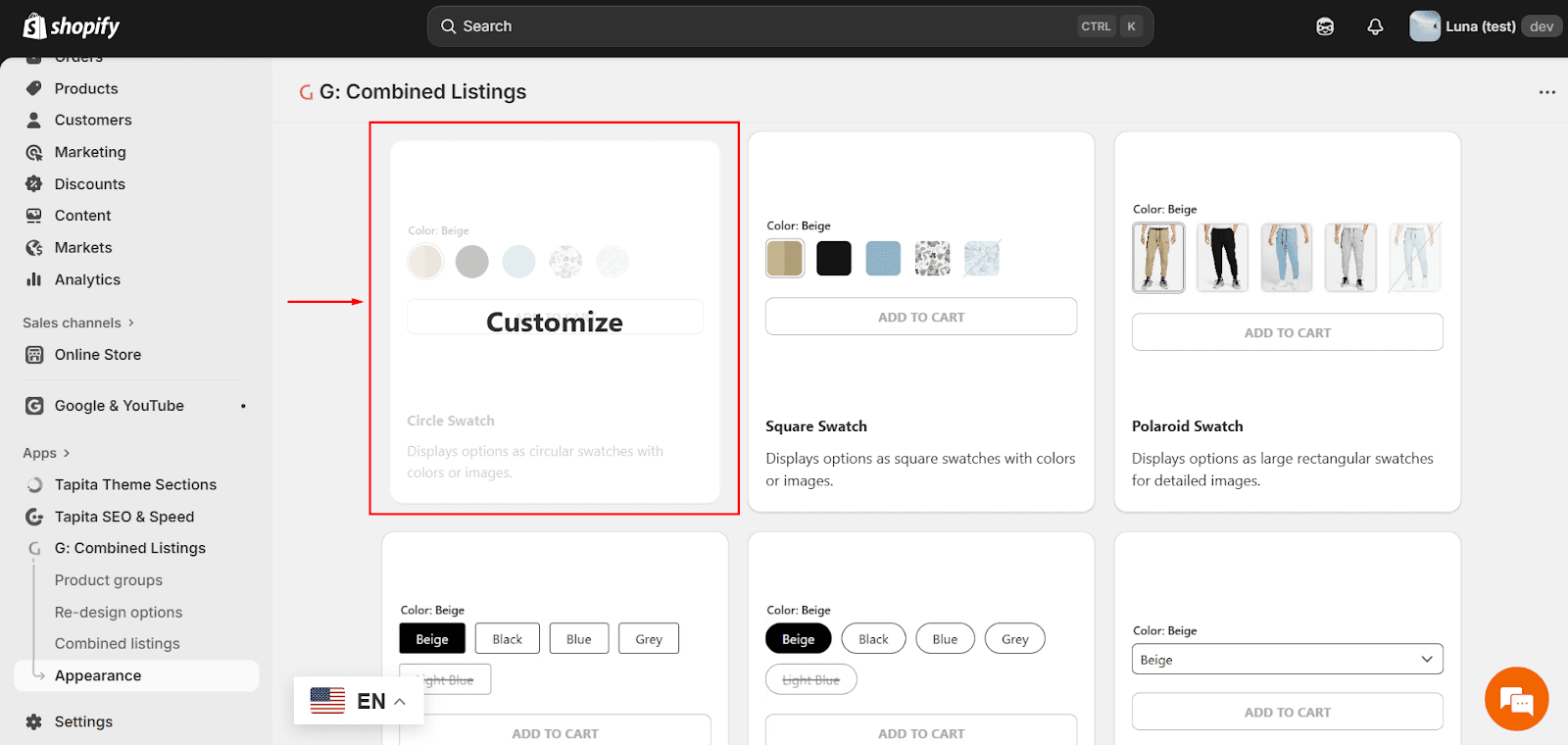 If you want your Color Swatch styles to match your product page designs rather than a generic and default template, go for the ‘Appearance’ feature in G: Combined Listings.