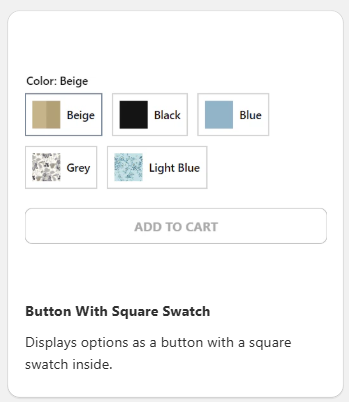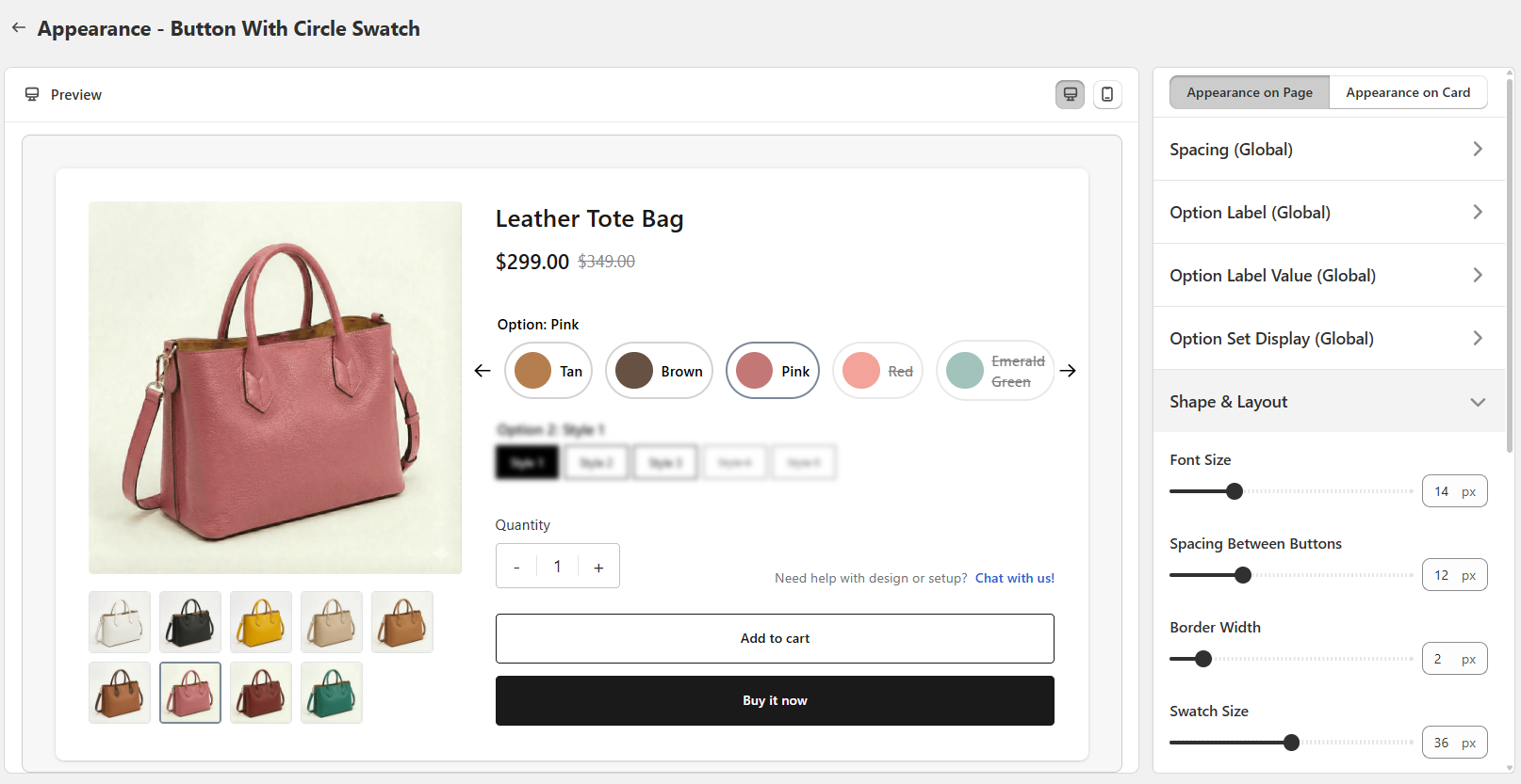 Button With Circle Swatch and Button With Square Swatch have the same condition and options for configurations. Therefore, this guide will tell you how to configure the swatches with a comprehensive and applicable guideline for both swatch styles and both Appearance on Page and Appearance on Card.