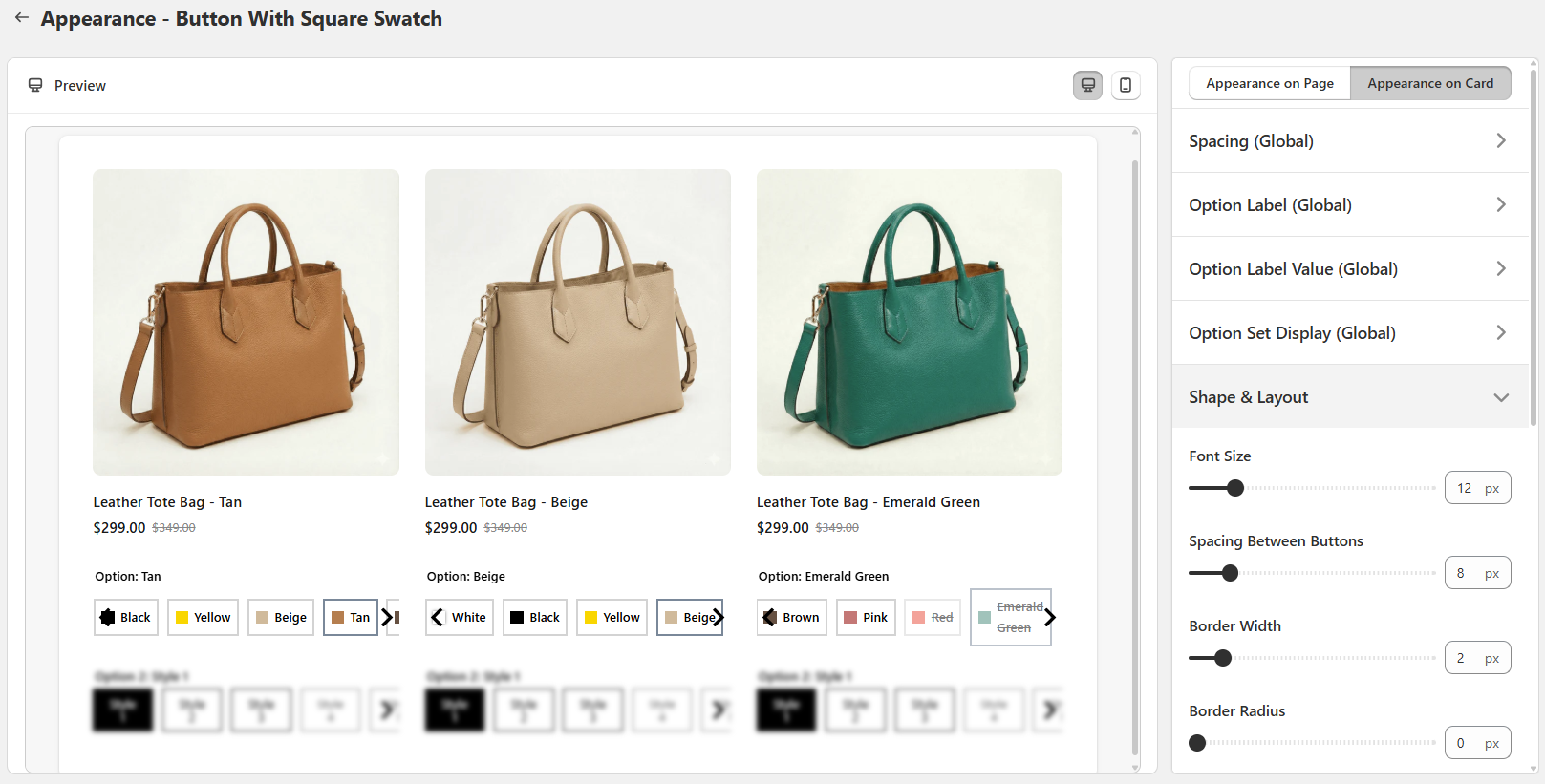 NOTE: Appearance on Page and Appearance on Card have the same condition and options for configurations. Therefore, this guide will give a comprehensive and applicable guideline for both Appearance on Page and Appearance on Card. To go to Appearance on Page and Appearance on Card configurations, locate to the left tab menu after clicking ‘Customize’ on a certain Color Swatch style. On the right side, you can see the preview section of how your customizations will show up on the storefront.