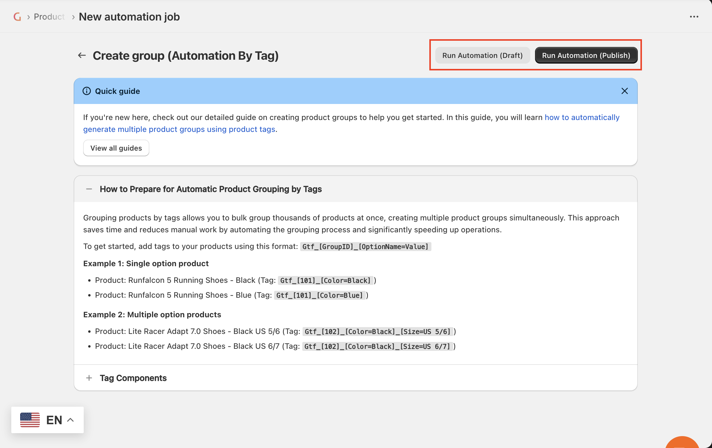 After a product is created, if a matching tag is added to the product within 30 minutes of creation, the product will be automatically added to the corresponding Auto by Tag group.