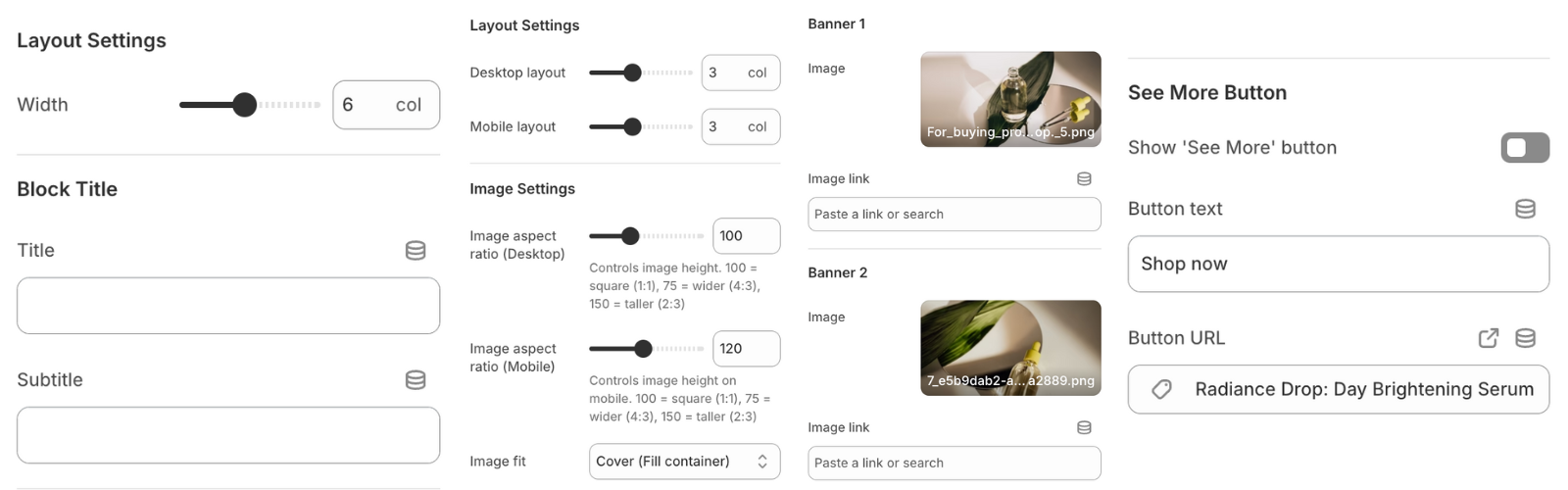 - Image aspect ratio (Desktop / Mobile): Define the shape of the images.