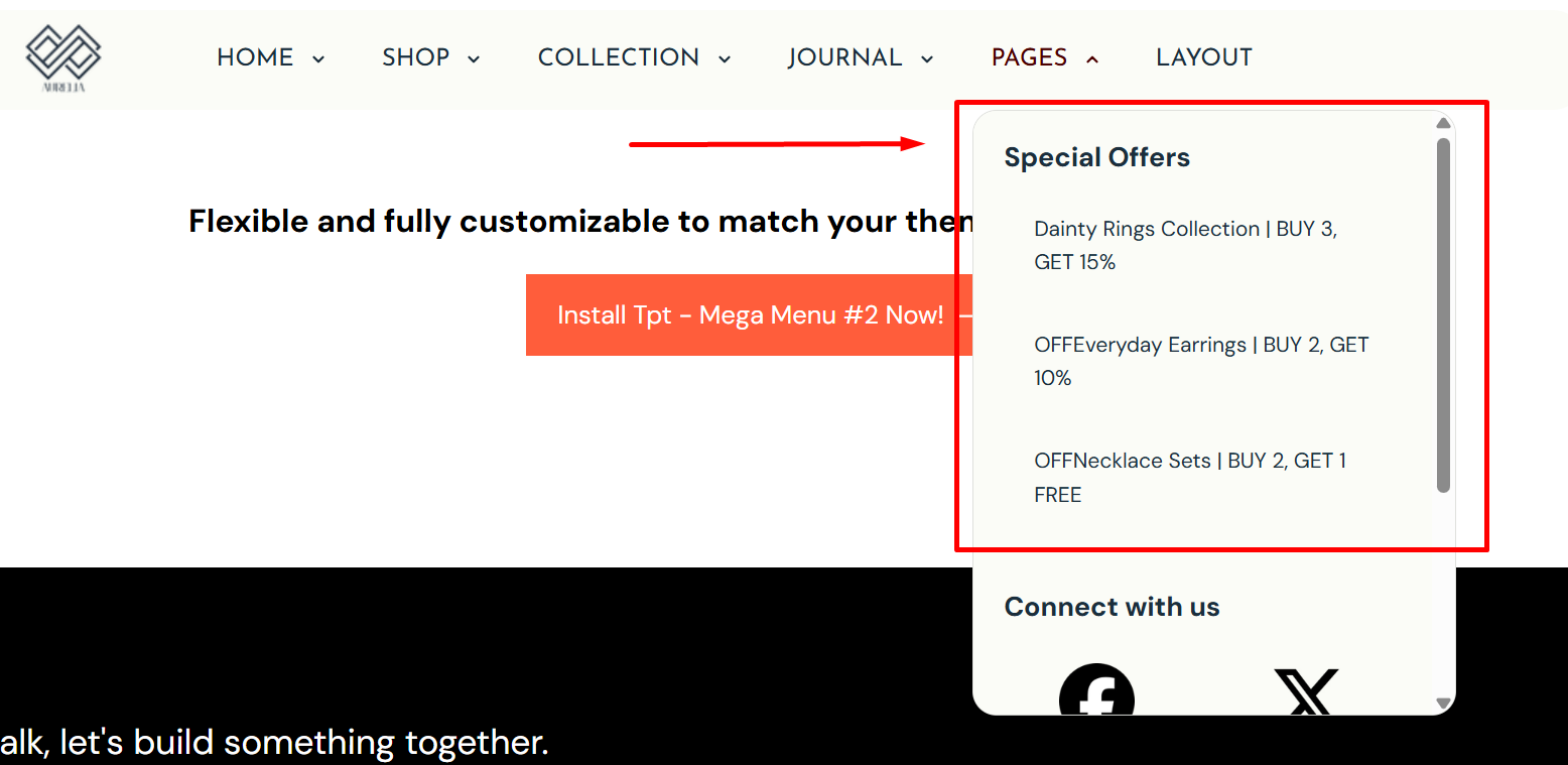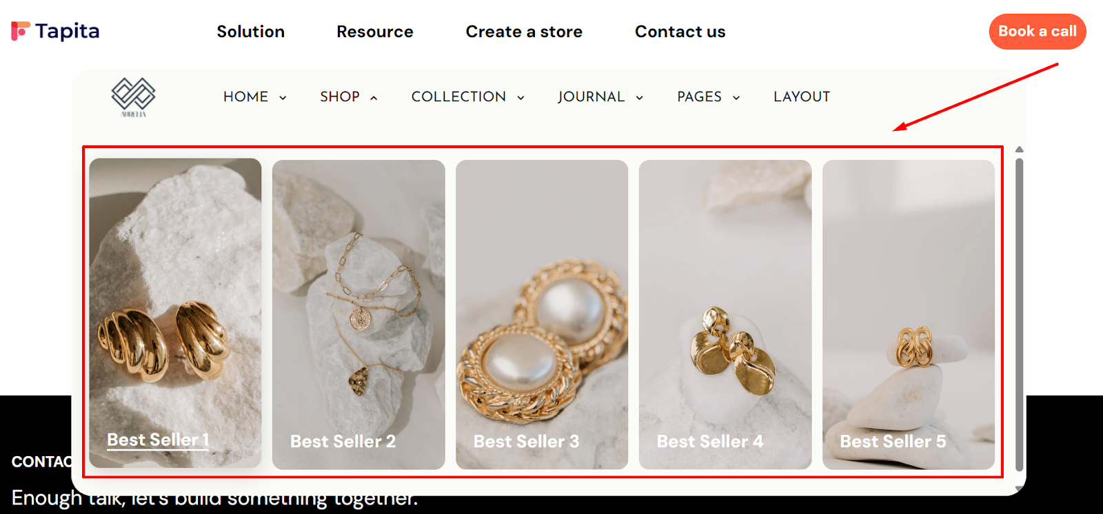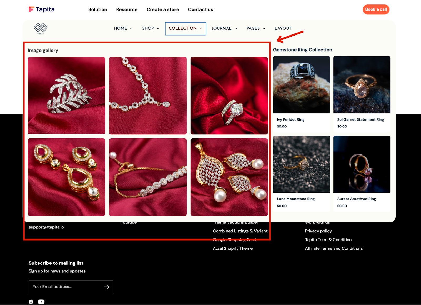 Tapita Mega Menu #2 Section is a powerful, flexible navigation section that lets you display a rich dropdown menu with multiple content blocks. You can showcase collections, blog posts, product grids, image galleries, and more, all inside a menu item.