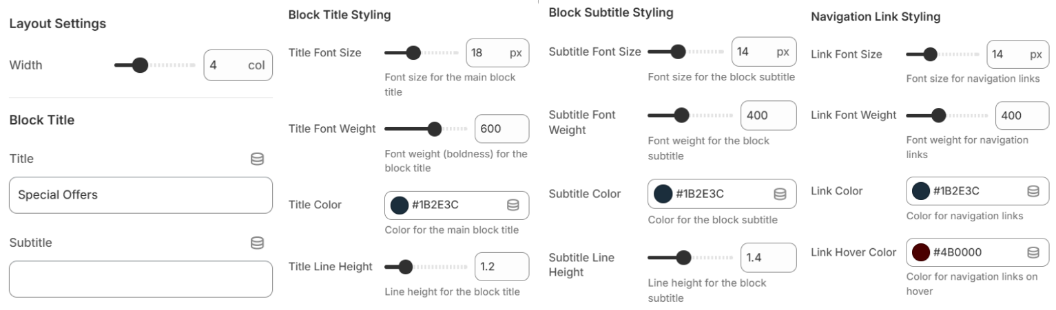 - Custom title for this block. Note: menu item’s name which is set in the Menus of Shopify Settings will overwrite the block title.
