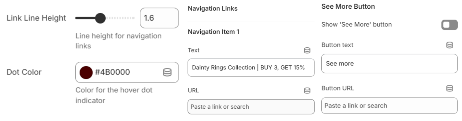 Each block represents one clickable menu item (like Home, Shop, Collections, etc.). You can customize the layout and content of each block independently.